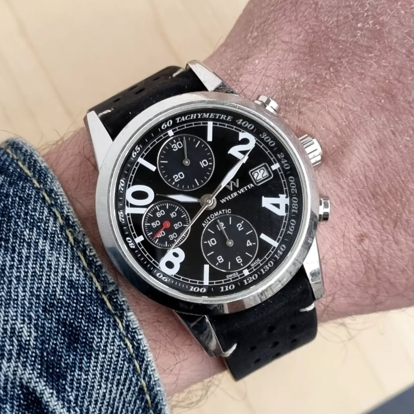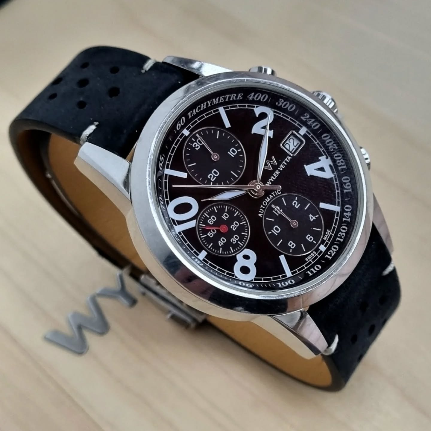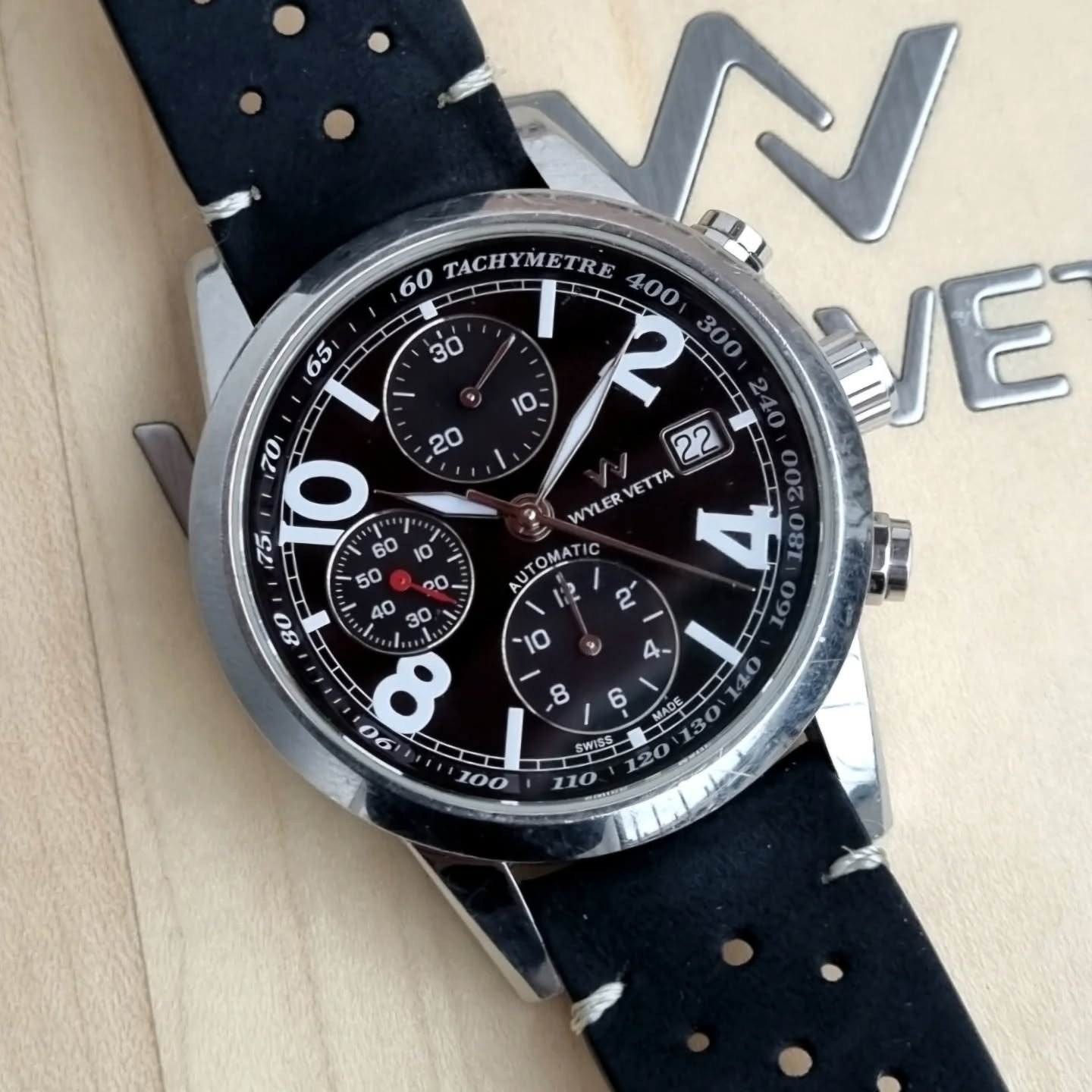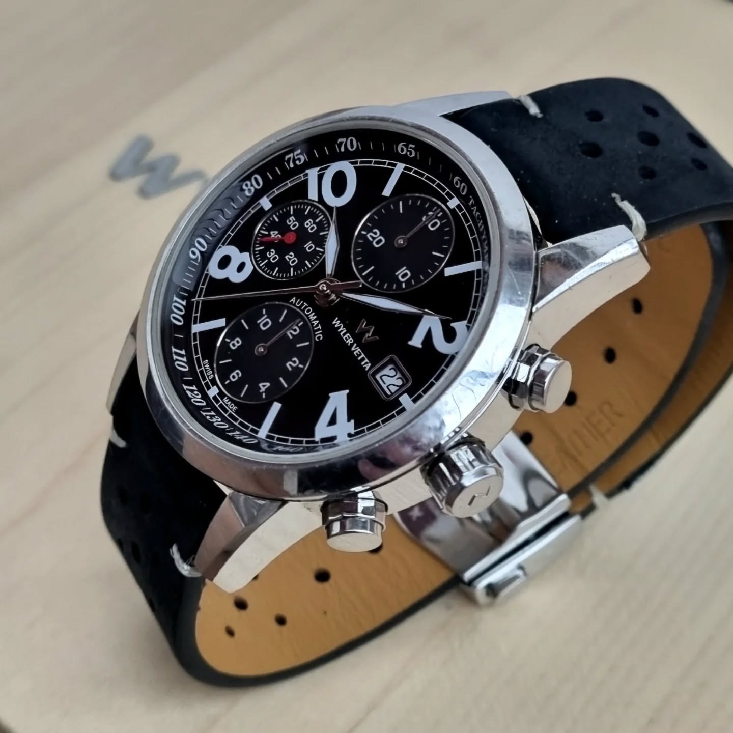 Cronografo automatico Wyler Vetta dal carattere sportivo e grintoso, appartenente alla collezione Espacite della maison, prodotto nei primi anni 2000